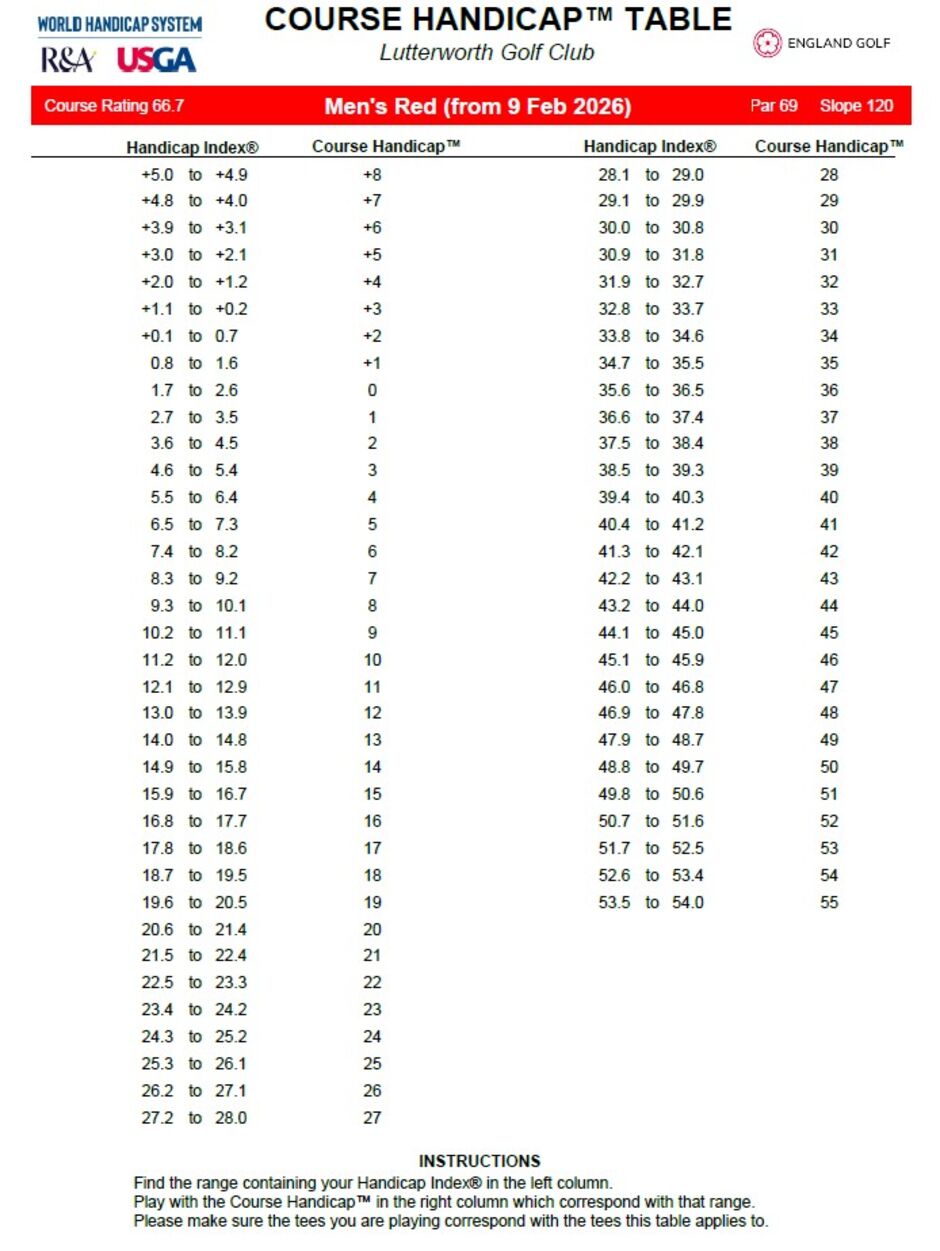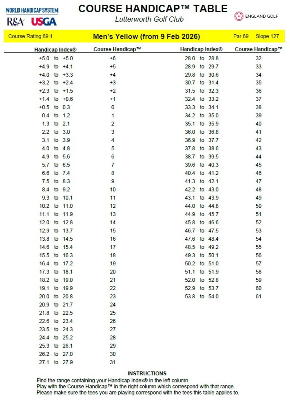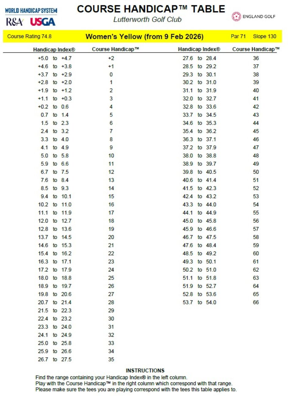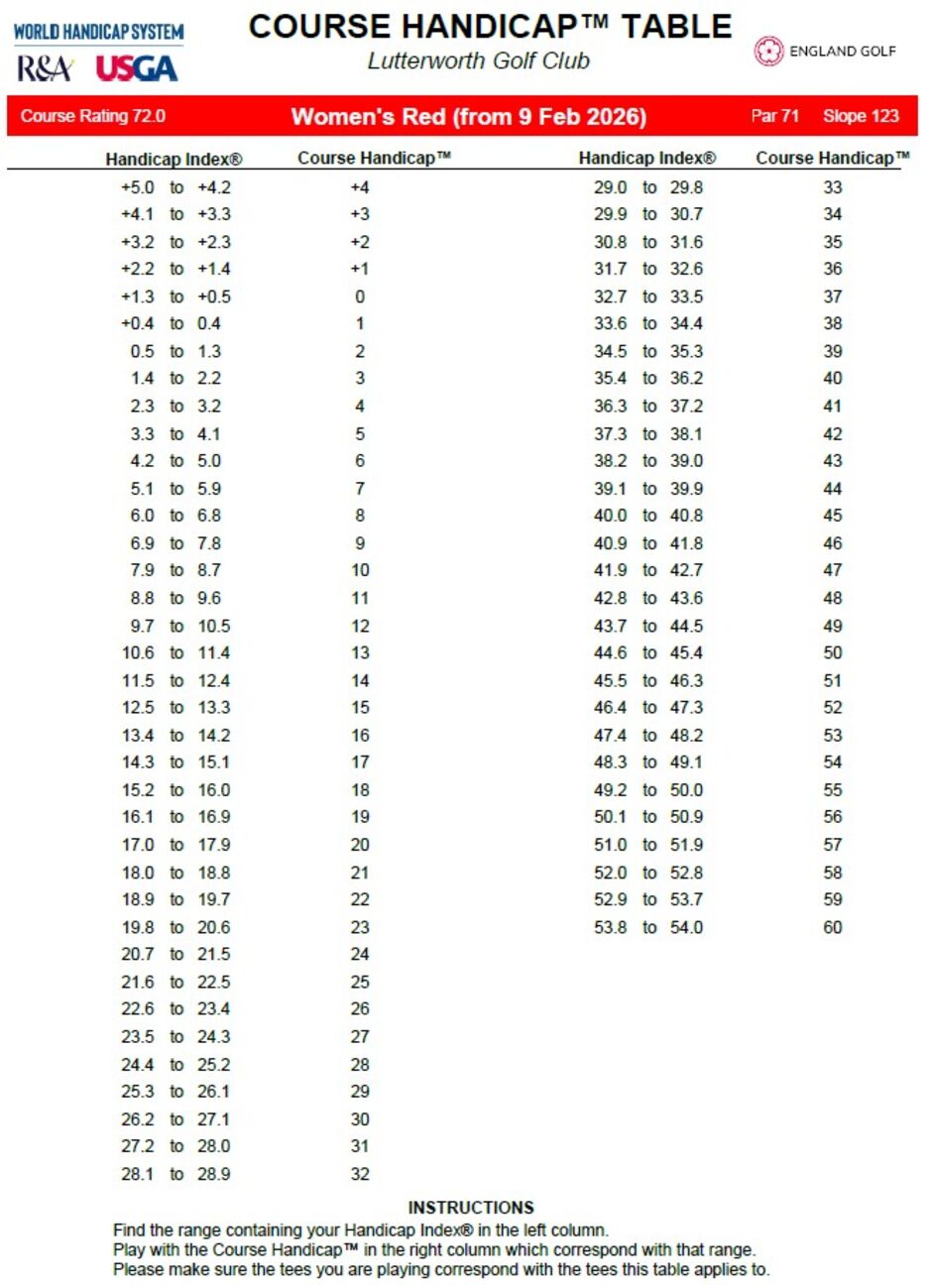 Course Handicap Tables, effective from the 9th February 2026, and reflecting course rating minus par (CR-PAR) are below.